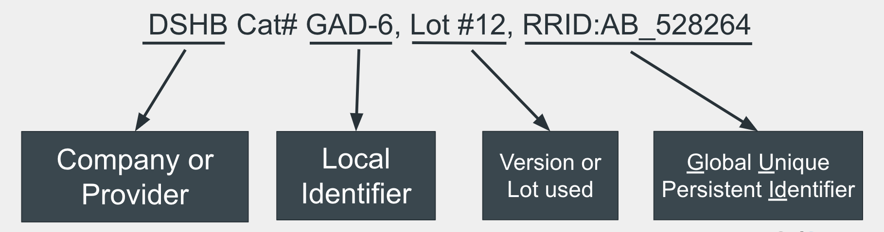 The RRID is a Persistent Unique Identifier assigned to help researchers cite key resources (antibodies, model organisms and software projects) in the biomedical literature to improve transparency of research methods. They are machine readable, free to generate and access, and consistent across publishers and journals. They are meant as a tool to improve scholarly communication and scientific reproducibility.