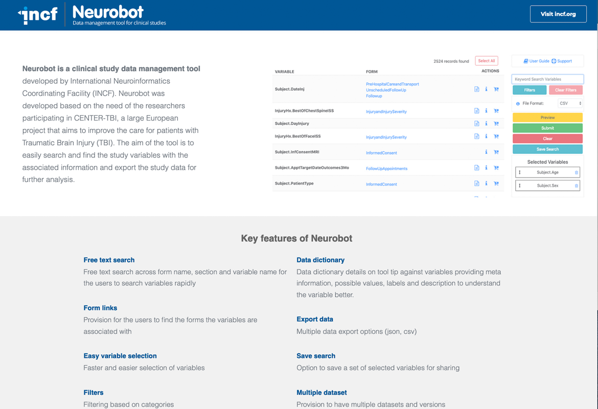 Neurobot is a clinical study data management tool developed by INCF. CENTER-TBI, a large European project that aims to improve the care for patients with Traumatic Brain Injury (TBI) is the first study using Neurobot and it was customised based on the feedback from researchers in the project.
